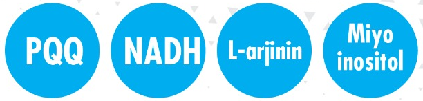 Miyo inositol, Yardımcı Madde Maltodekstrin, L-arjinin, Hacim artırıcı İzomalt, L-karnitin L-tartarat (L-karnitin), Betain HCl, L-sistin, L-askorbik asit (Vitamin C), Aroma Verici Mango Aroması, Dl-alfa-tokoferil asetat (Vitamin E) Çoban çökerten (Tribulus terrestris) ekstresi, Lepidyum (Lepidium meyenii (Maca)) ekstresi, Çinko pikolinat (Çinko), Kore ginsengi (Panax ginseng) ekstresi, Folik asit (Vitamin B9), Astaksantin, Beta-Nikotinamid Mononükleotid (NMN Koenzim Q10, Pirolokinolin Kinon (PQQ), NADH/Nikotinamid Adenin Dinükleotid Hidrit, Kolekalsiferol (Vitamin D3), Riboflavin (Vitamin B2), Kalsiyum-metilfolat (Folik asit), Selenyum, Metilkobalamin (Vitamin B12).